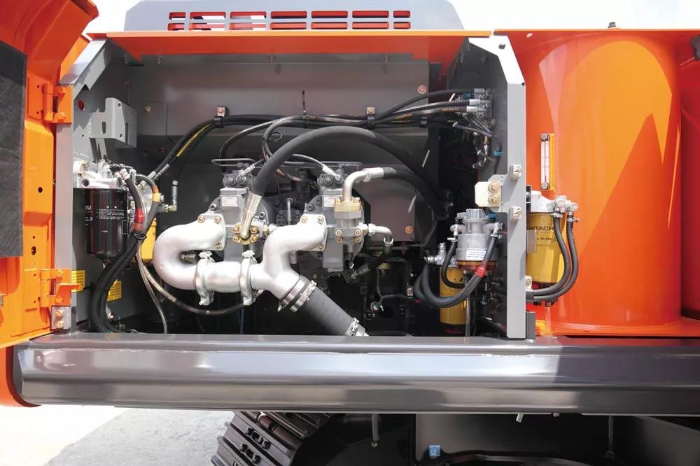 挖掘機的第二核心部件:液壓泵,還是采用高可靠性的分體式斜軸式柱塞泵。泵室布局著日常保養的濾芯,燃油主濾、燃油預濾、先導濾清器、機油濾清器和電動燃油泵集中在這,方便維護保養。